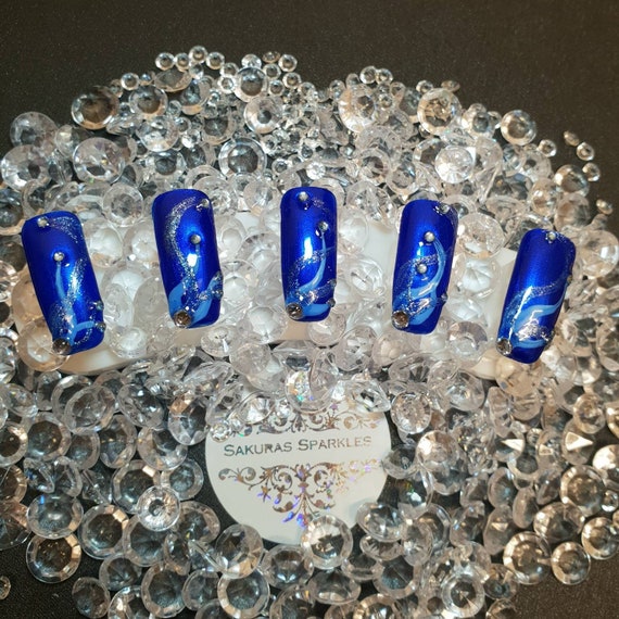 Deep Blue Swirl Hand Painted Nails Royal Blue Rhinestones Etsy